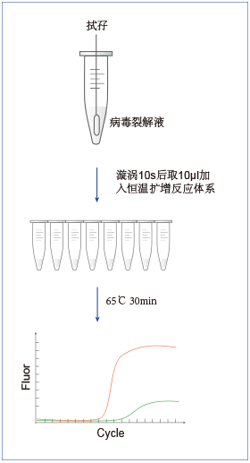 利用LAMP(Loop-mediated isothermal amplification)扩增技术, 在恒温条件下,呈指数级别放大核酸分子特性,其在25分钟内将RNA或DNA放大109~1010倍。采用FAM-BHQ荧光切割探针实时检测,可在常规定量PCR仪或便携式恒温荧光检测仪上进行。